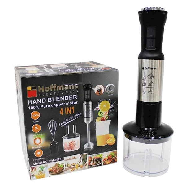 Блендер погружной с сменными насадками Hoffmans 4 in1 1000W HM-8026 – отличный блендер, который способен измельчить большие объемы продуктов за несколько мгновений. Внутри кувшина масса циркулирует в горизонтальном и вертикальном направлениях. Блендер имеет мощность 1000 Вт и две скорости, благодаря чему можно подбирать режим измельчения для каждого продукта. Благодаря богатому функционалу быстро покрошите овощи для салата или мгновенно превратите в пюре приготовленный суп. Погружной блендер Hoffmans 4 in1 – это удобный и многофункциональный кухонный прибор, который обязательно пригодится в каждой кухне. Благодаря сменным насадкам вы сможете легко перемешивать, измельчать, взбивать и венчиком. Мощность 1000 Вт обеспечивает быстрое и эффективное приготовление блюд. Компактный размер и удобная рукоятка делают его легким в использовании и хранении. Модель HM-8026 отличается стильным дизайном, что гарантирует долгий срок службы и безупречное выполнение каждой задачи.