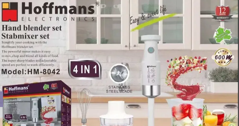 Блендер погружной со сменными насадками Hoffmans 4in1 600W HM-8042– это отличный блендер, который способен измельчить большие объемы продуктов за несколько мгновений. Внутри кувшина масса циркулирует в горизонтальном и вертикальном направлениях. Блендер имеет мощность в 600 Вт и две скорости, благодаря чему можно подбирать режим измельчения для каждого продукта. Благодаря богатому функционалу быстро покрошите овощи для салата или мгновенно превратите в пюре приготовленный суп. Погружной блендер Hoffmans 4in1 — это удобный и многофункциональный кухонный прибор, который обязательно пригодится в каждой кухне. Благодаря сменным насадкам вы сможете легко перемешивать, измельчать, взбивать и венчиком. Мощность 600 Вт обеспечивает быстрое и эффективное приготовление блюд. Компактный размер и удобная рукоятка делают его легким в использовании и хранении. Модель HM-8042 отличается стильным дизайном, что гарантирует долгий срок службы и безупречное исполнение каждой задачи.