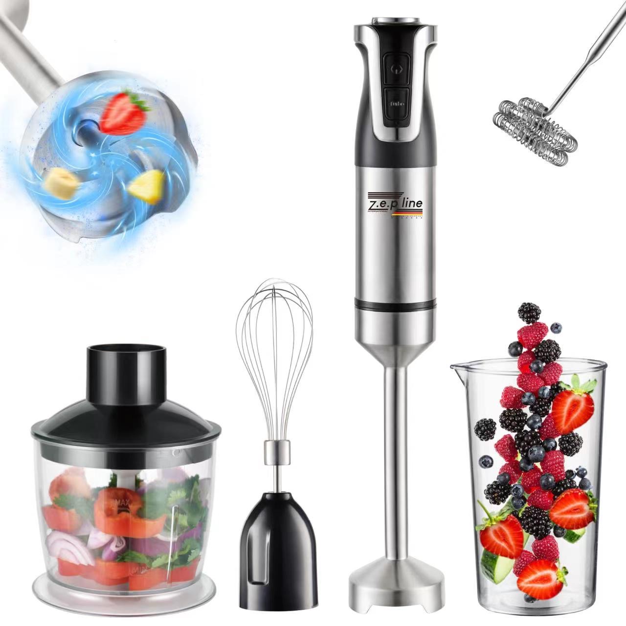Погружной блендер ручной 5 в 1 на 1500 Вт с измельчителем и насадками миксер и вспениватель молока 20 скоростей и чаша Zepline