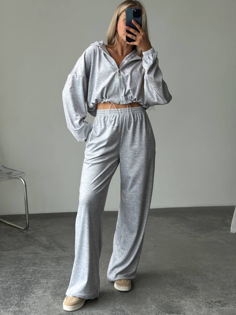 Велюровый костюм, в котором хочется проводить целый день – мягкая кофта снизу на затяжках, окутывает комфортом, а штаны на затяжках подчеркивают легкость движений.