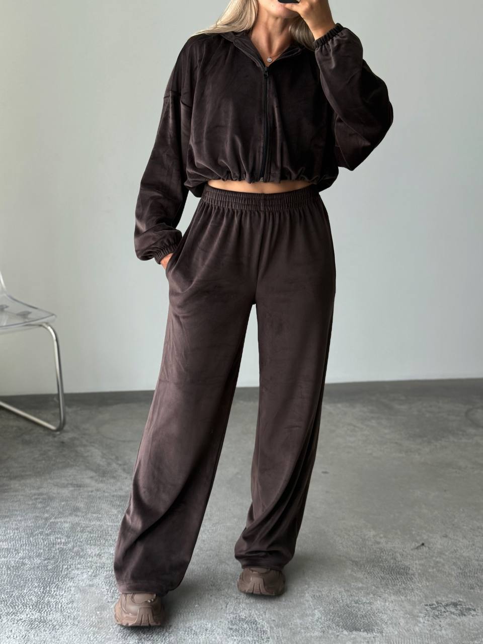 Велюровый костюм: кофта и штаны снизу на затяжках шоколад