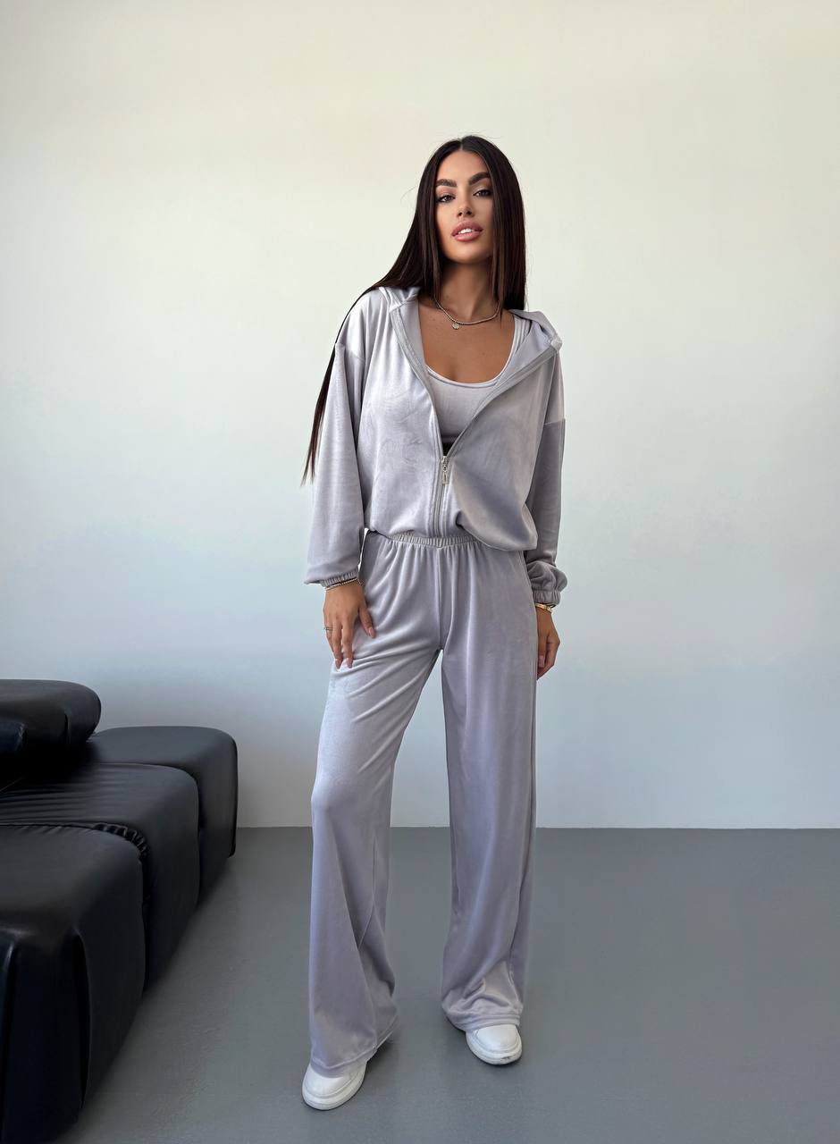 Велюровый костюм-тройка: штаны палаццо + кофта на молнии + топ серый