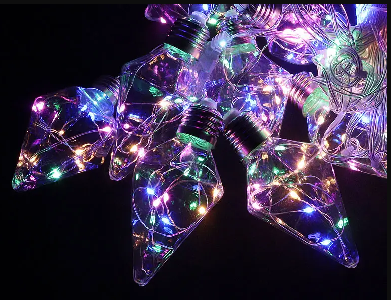 Гирлянда состоит из нити, на которой разложены большие лампочки пирамиды, освещаемые светом светодиода.