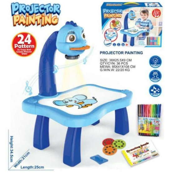 Детский Проектор Для Рисования Со Столиком Projector Painting Проектор Со Слайдами Описание: Рисование — занимательное занятие для детей всех возрастов. Создавать образы нравится каждому, но не каждый ребенок умеет это делать. А когда что-то не получается, то и продолжать не очень хочется. Дети в этом плане легко ранимы, им необходимо, чтобы все получалось. Представляем вам помощника в рисовании — детский проектор со столиком Projector Painting. С его помощью любой ребенок сможет изобразить животное или машинку. Детский проектор для рисования со столиком — это технически несложное устройство, представляющее собой небольшую мини-лампу, проецирующую свет на пластиковую доску. В комплекте к проектору поставляется три слайда, на которых есть по 8 картинок. Каждую из этих картинок можно спроецировать на столик, обвести, а затем раскрасить, тем самым получив свою веселую картинку. Projector Painting помогает детям дошкольного и младшего школьного возраста развивать мелкую моторику, творчески выражаться, фантазировать. С ним у каждого ребенка в конце будет отличный результат. Детям очень нравится процесс срисовывания. Можно настроить размер картинки, повернув лампу, а также размыть или сделать изображение более четким. Бонусом при работе с проектором звучит веселая музыка. Проектор состоит из столика с лампой и лупой. В верхнюю часть вставляются диски с картинками, включается свет и ребенок может наводить рисунок на листе под проектором. В комплекте набор дисков с картинками на разные темы: фрукты овощи машины животные школьные принадлежности спорт Комплектация: проектор со столиком 6 дисков с картинками 10 разноцветных фломастеров Проектор изготовлен из яркого надежного и качественного пластика Проектор работает от 3х батареек АА Характеристики: Назначение: детский проектор для рисования Возраст: от 3-х лет Материал: пластик Для работы нужны 3 батарейки типа АА (в комплекте нет, необходимо докупать) Комплектация: проектор-столик, 3 слайда, 12 фломастеров, бумага для рисования