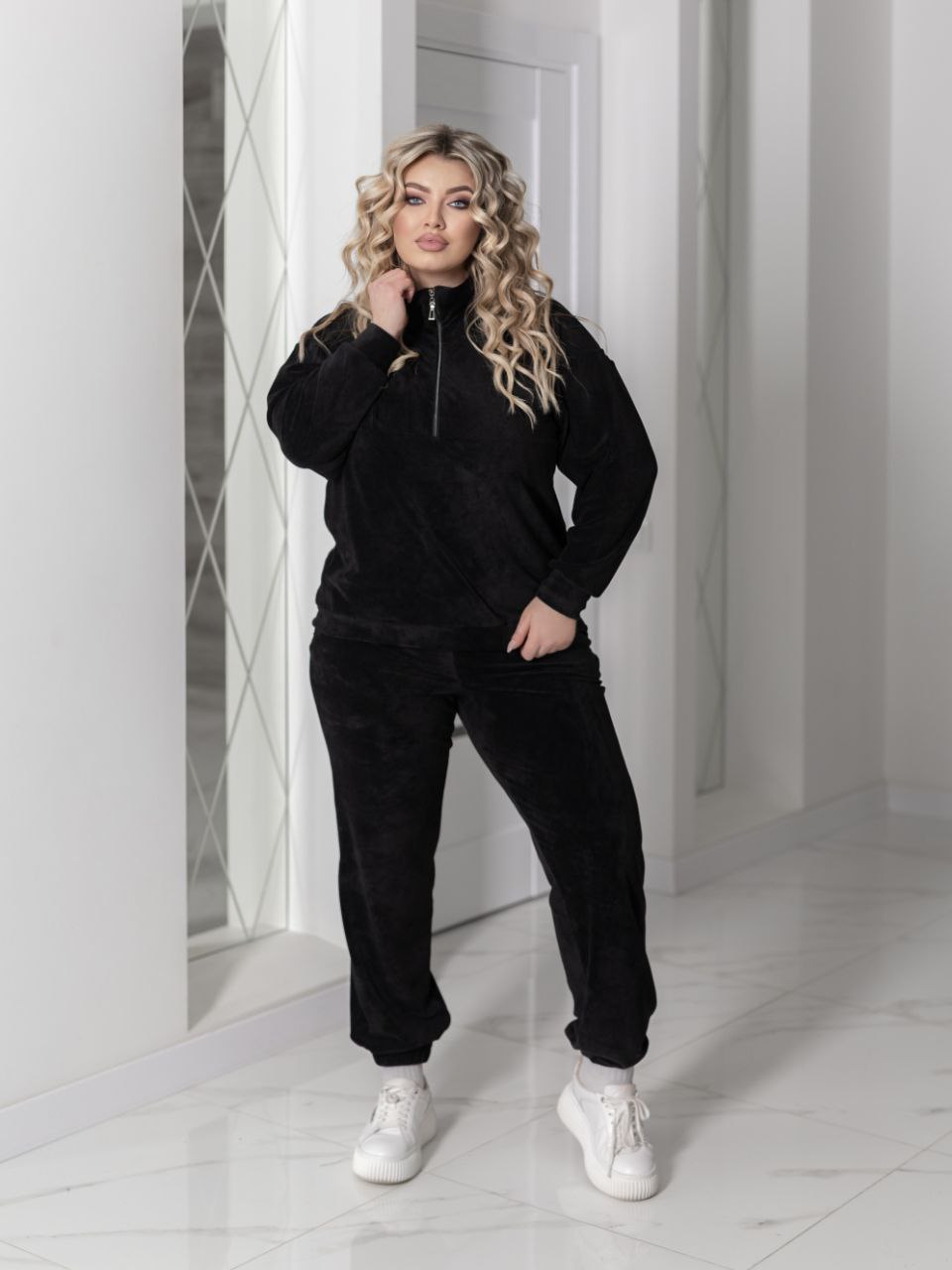 Женский мягкий, комфортный спортивный костюм. Комплект состоит из свитшота свободного кроя с длинными рукавами и короткой молнией спереди, что придает удобству и стильному акценту. Брюки прямого силуэта с эластичными манжетами внизу.