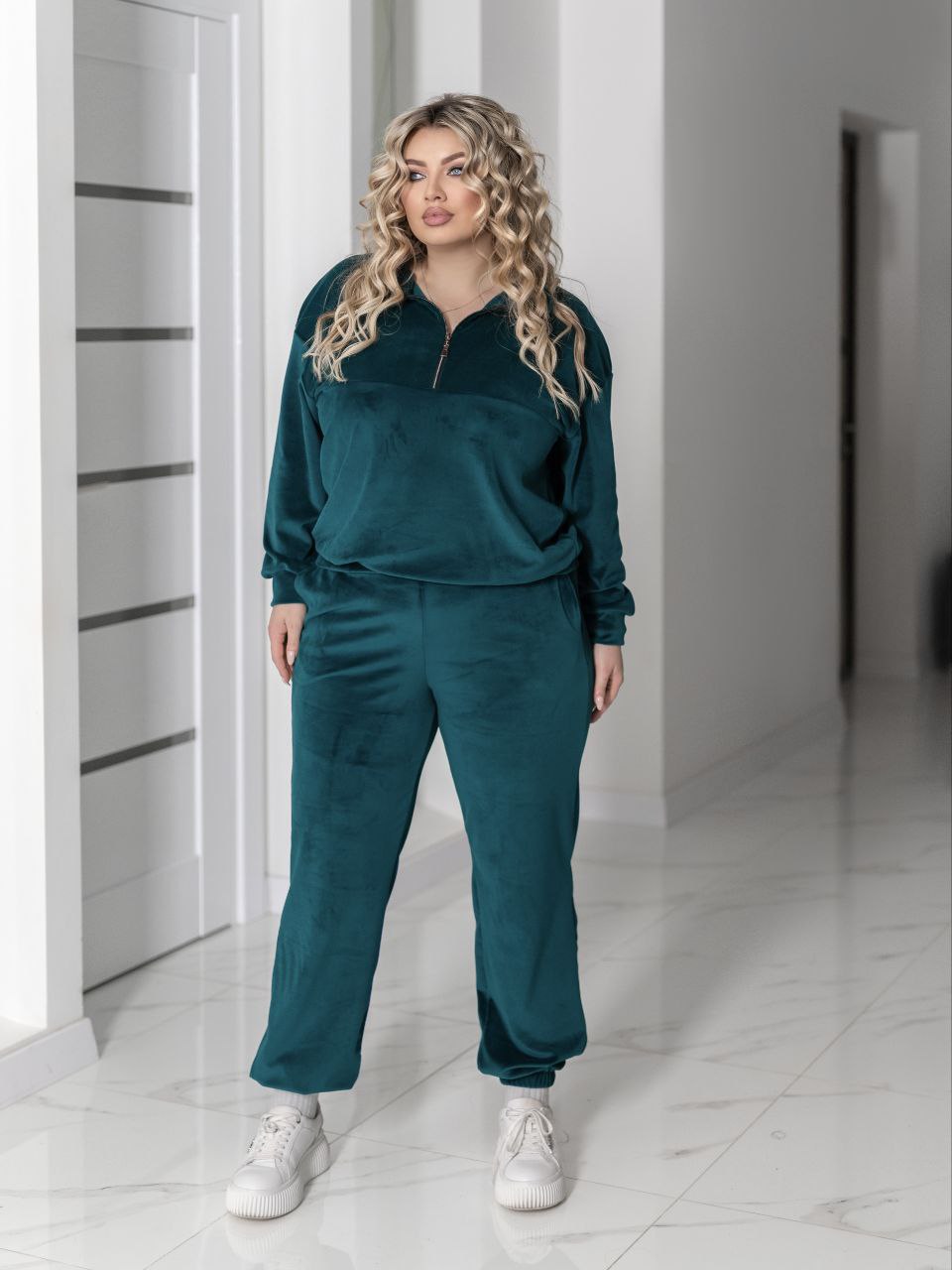 Женский мягкий, комфортный спортивный костюм. Комплект состоит из свитшота свободного кроя с длинными рукавами и короткой молнией спереди, что придает удобству и стильному акценту. Брюки прямого силуэта с эластичными манжетами внизу.