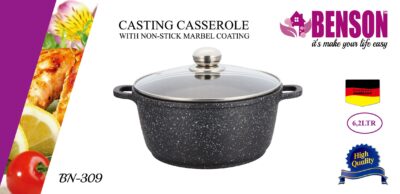 Кастрюля Benson с мраморным антипригарным покрытием. Объем 6,2 л. Изготовлена из литого алюминия — идеальный материал для жарки и тушения продуктов.