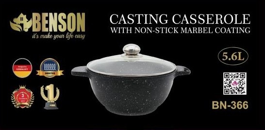 Кастрюля Benson BN-366 с мраморным антипригарным покрытием. Объем 5,6 л. Изготовлена из литого алюминия — идеальный материал для жарки и тушения продуктов.