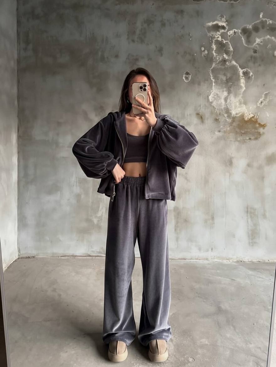 Костюмчик тройка из велюра: кофта+топ+прямые штаны графит