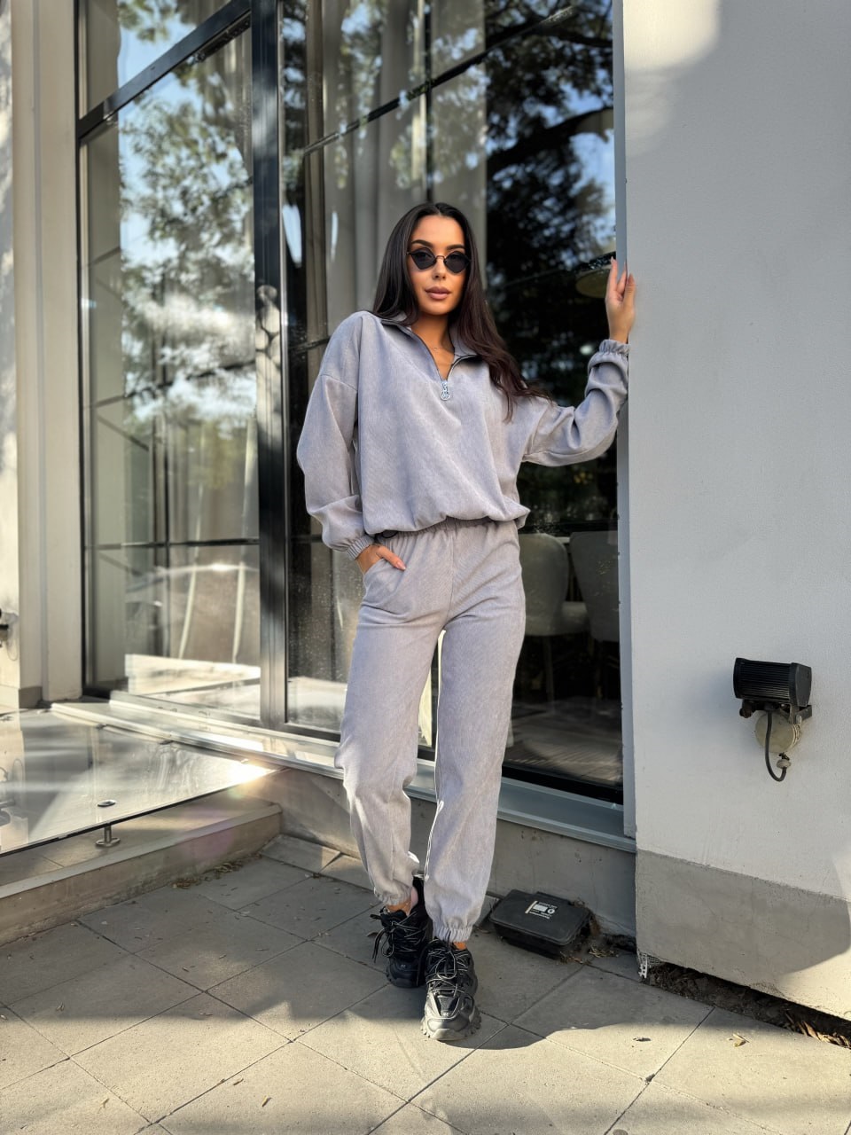 Костюм из микровельвета (кофта по низу резинка+воротник на молнии+брюки с манжетой) серый