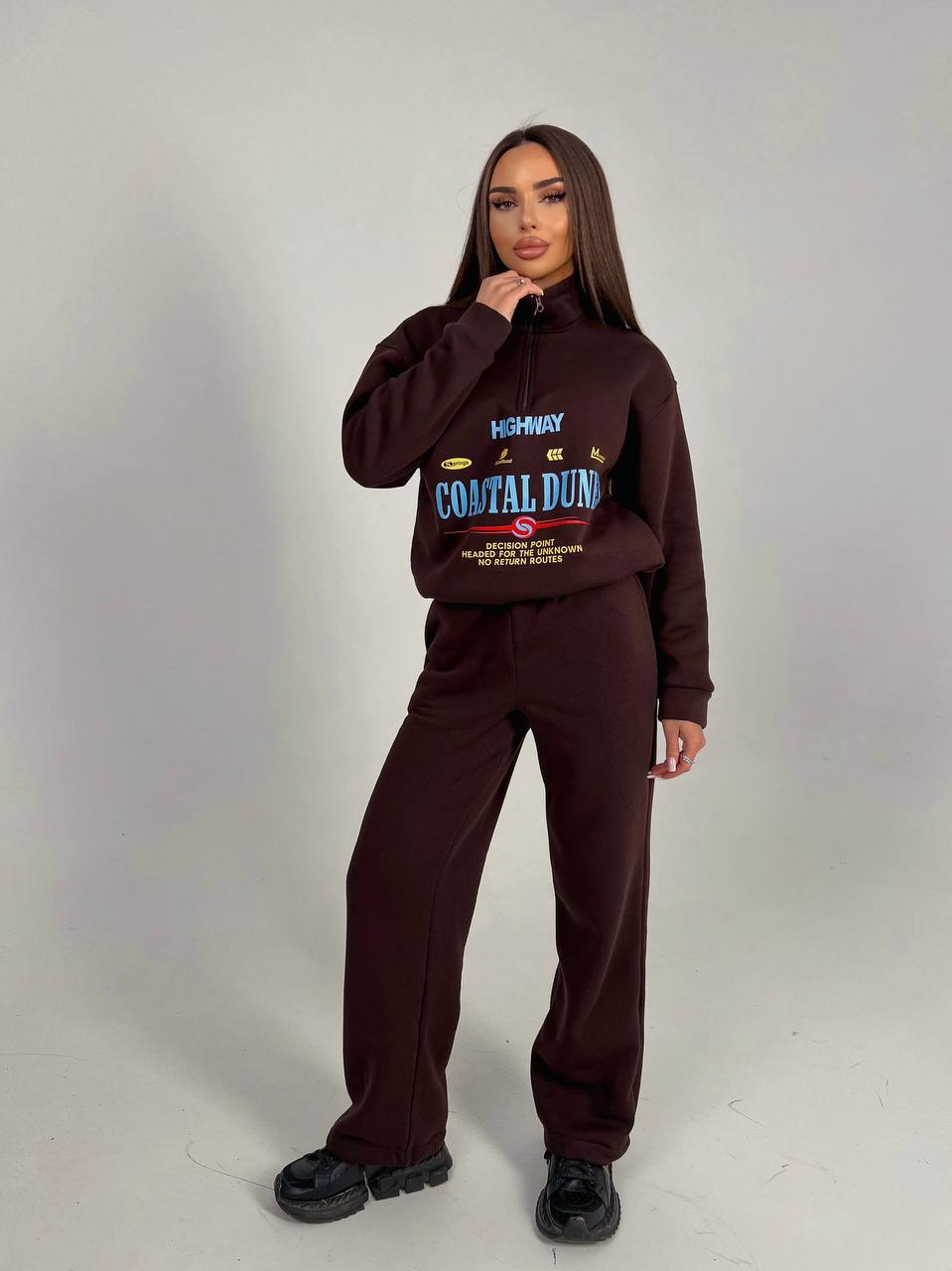 Костюм (свитшот с накатом по низу затяжки+брюки высокая посадка по низу затяжки) шоколад