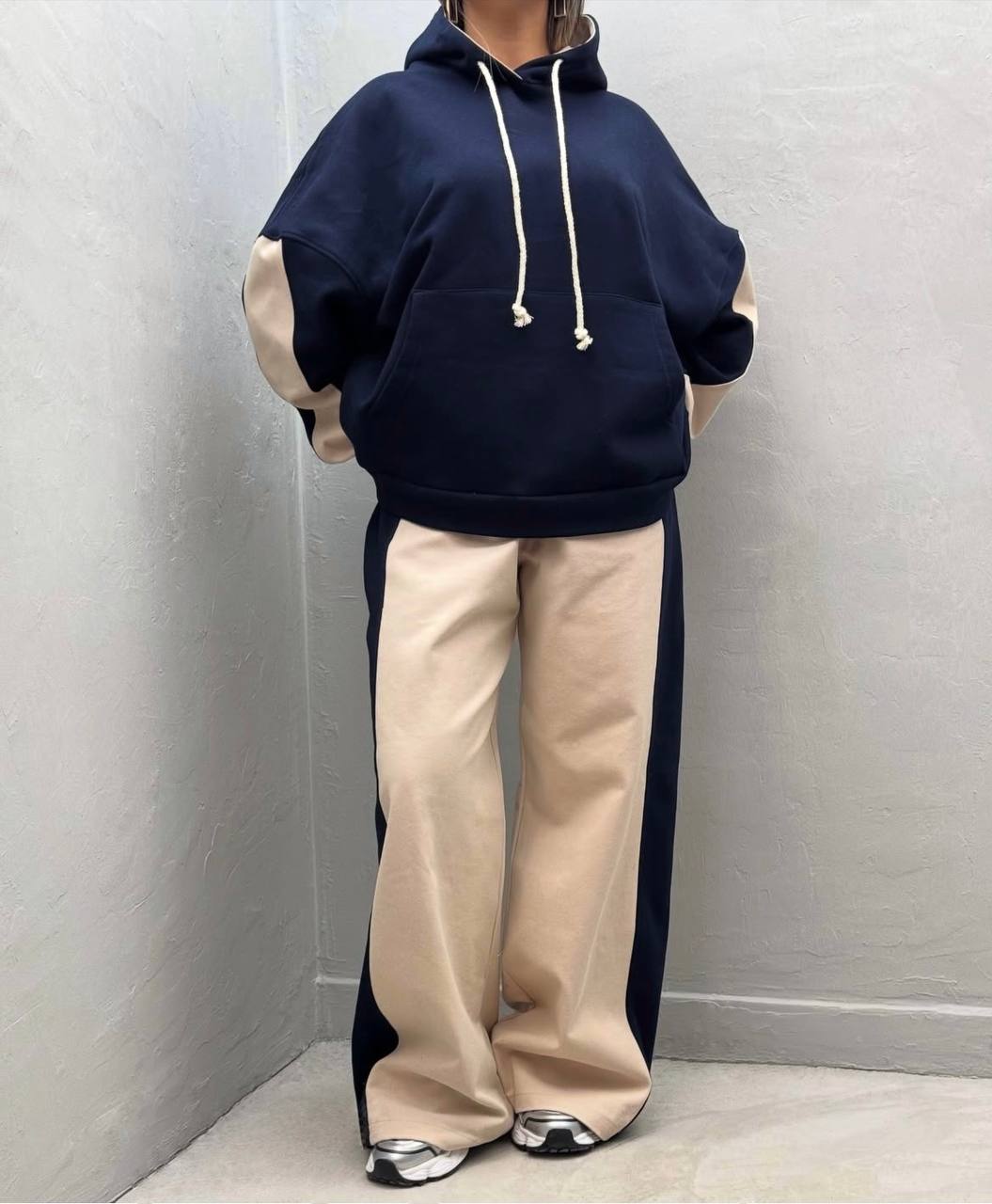 Костюм со вставками: свободно худи с капюшоном и карманом кенгуру. Просторные и широкие брюки с высокой талией и карманами по бокам в стиле палаццо создают стильный вид, низ регулируется фиксатором, что позволяет носить свободно или затянуть.