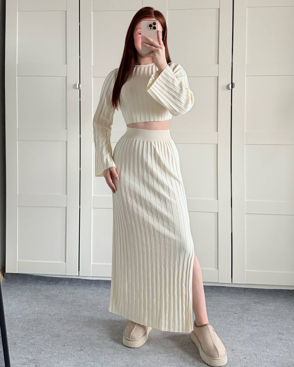 Костюм топ с широкими рукавами+длинная юбка с разрезом молоко