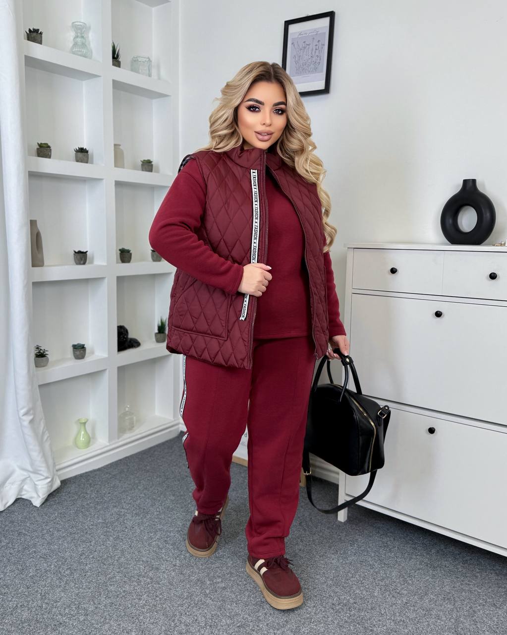 Будьте первым, кто оставил отзыв на “Костюм-тройка: Жилетка из стеганой плащевки+брюки с лампасами+кофта бордо”