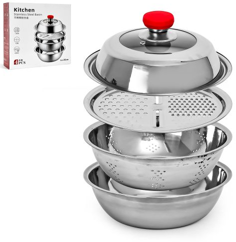 В комплект входят миска, дуршлаг на ножке, тёрка и крышка, что позволяет мыть, процеживать, натирать и хранить продукты с помощью одного набора.