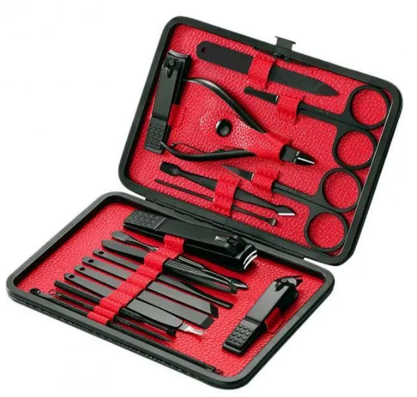 Маникюрный педикюрный набор состоит из 18 предметов, изготовленных из прочной медицинской стали.