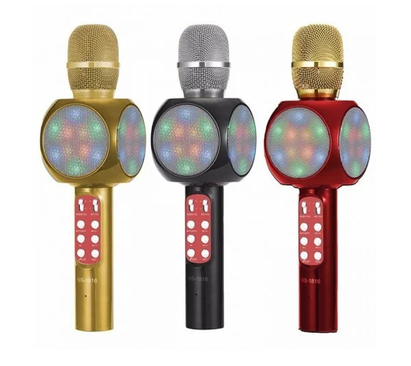 Микрофон DM Karaoke 1816 — звучание стильный дизайн, успейте приобрести в нашем интернет магазине! Микрофон с функцией караоке Wster WS-1816 Karaoke — это оригинальное устройство объединившее в себе вокальный Bluetooth микрофон и мини колонку с МП3 и ФМ. Мобильный караоке-микрофон Wster WS1816 может стать отличным инструментом для начинающих вокалистов или средством скрасить приятный вечер в компании друзей. Портативный комбо-микрофон можно использовать как MP3-плеер, переносную колонку с FM приемником или караоке-микрофон в комбинации со смартфоном или планшетом, и даже как мобильное зарядное устройство в экстренных ситуациях. Модель Встер WS-1816 оснащена беспроводным модулем Bluetooth, слотом USB и microUSB для чтения музыкальных файлов. Ручная караоке система Wster WS-1816 заслуженно может называться ультра мобильной! Wireless Microphone отлично подойдет для домашнего использования, в подарка ребенку или для профессиональной эксплуатации ведущим на праздник/вечеринку или другое торжество. Микрофон имеет встроенный аккумулятор и динамики, а значит что он не «привязан» ни к розетке, ни к дополнительной акустике. Оцененная по достоинству многими покупателями портативная караоке система Wster-WS1816 это одна из лучших моделей по соотношению цена/качество, а так же по набору функций. Особенности Wster WS-1816: Беспроводная связь по Bluetooth универсально совместима с любыми устройствами Трехуровневое подавление уровня шума в головке микрофона, направленный микрофон Проигрывает музыку со смартфона и позволяет петь под них, записывая свои композиции (встроенный слот для карты памяти для записи музыки в формате MP3) Вы можете выбирать уровень звукового эффекта эха Можно использовать как обычную MP3 портативную с FM колонку для проигрывания музыки со смартфона или планшета Модель имеет разъём для подключения наушников (удобно для людей, занимающихся вокалом) Современный протокол Bluetooth обеспечивает снижение потребления энергии при более стабильном соединение и скорости передачи сигнала на расстоянии до 10 метров Металлический корпус защищенный от ударов и падений способствует высокому звучанию и лучшим басам Широкий спектр применения: для пикника, поездки, вечеринки, семейные развлечения, пение в караоке и т. д. Характеристики: Модель: WS-1816 Дизайн: Ручной микрофон с аудио модулем, встроенные динамики Версия Bluetooth V4.0 + EDR Совместимость: любые Bluetooth устройства Расстояние подключения: до 10м Мощность спикера: 3W Частота: 100Hz-10kHz SPL: 115 дБ, THD — менее 1% Чувствительность: -40 ± 3 дБ Интерфейс: 3,5 мм (наушники), Micro USB, TF слот для карты, USB Поддержка файлов: MP3, WMA FM приемник с автопоиском и памятью станций Источник питания: USB, встроенная батарея Рабочее время: 5-8 часов Тип встроенной батареи: Литий-ионный аккумулятор 3.7V, 1800 mAh Материал: Алюминий, ABS пластик Размер: 265 х 75 х 75 мм, ручка: 125 x 30мм, микрофон 55 x 50 мм Вес: 410 гр Комплектация: Колонка-Микрофон Wster WS-1816 Кабель питания USB/microUSB Руководс
