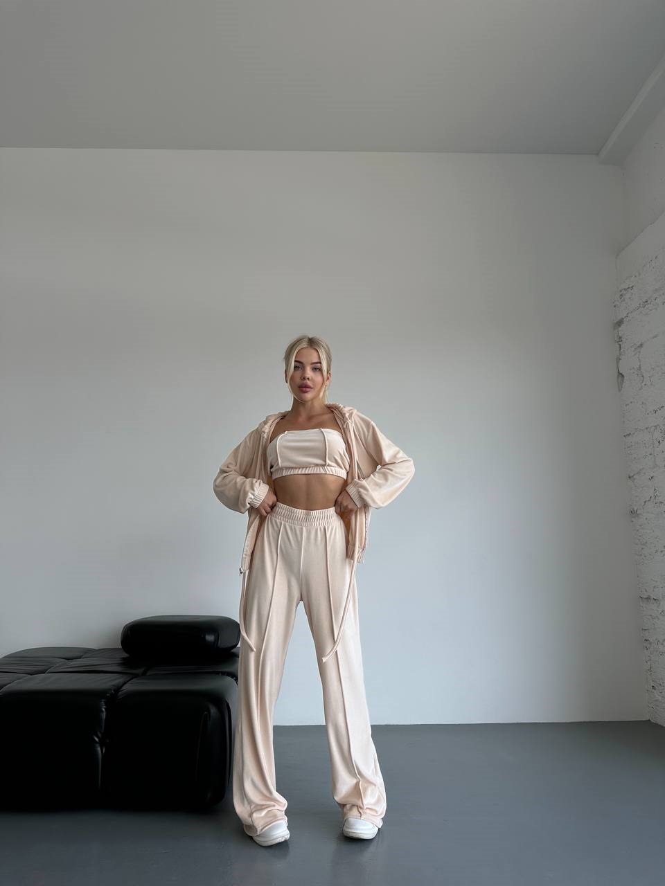 Мягкий плюшевый костюм тройка (топ+укороченная кофта с капюшоном+брюки) светло-бежевый