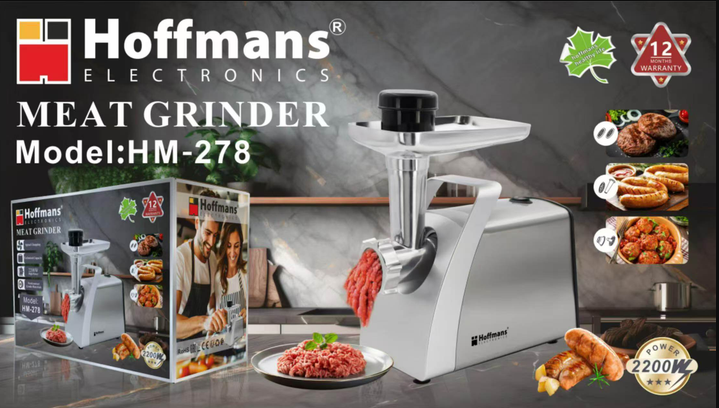 Откройте для себя кулинарные горизонты с мясорубкой Hoffmans! Мощный двигатель и реверсовая система легко справятся с любым мясом, корпус из нержавеющей стали гарантирует долговечность. Легко моется и собирается. В комплекте насадки для колбас и фарша, позволяющие реализовать любые кулинарные фантазии. Удобный толкач обеспечивает безопасное и равномерное измельчение. Стильный дизайн дополнит интерьер вашей кухни.