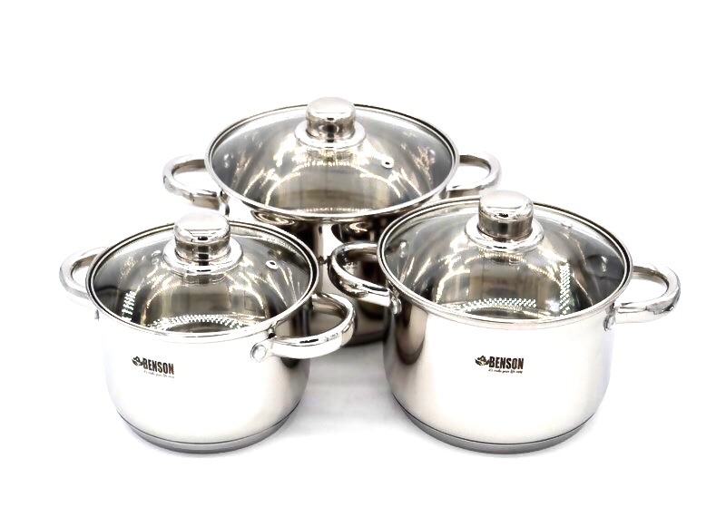 Набор посуды Benson BN-205 — это кухонный набор для приготовления пищи, состоящий из 3-х кастрюль и 3-х крышек. Кастрюли такого набора изготовлены из высококачественной стали, имеют 9-слойное дно, что обеспечивает превосходное распределение и сохранение тепла.