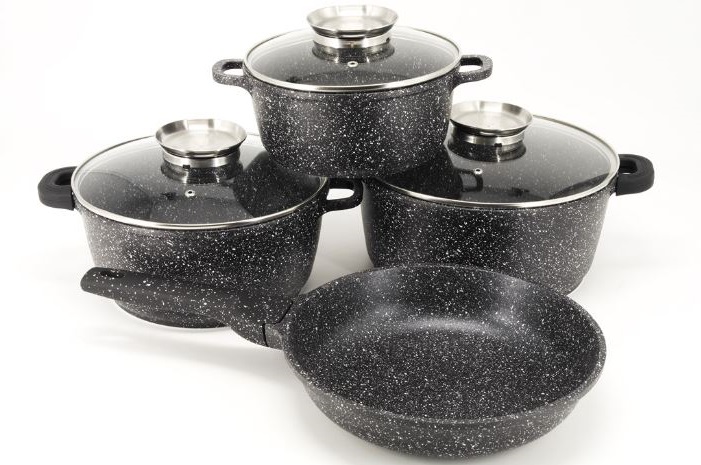 Набор кастрюль с антипригарным мраморным покрытием. Набор кастрюль имеет стеклянные крышки с ручкой, в которой находится масляный диспенсер, благодаря чему вы можете постоянно заливать масло, налитое в ручку во время приготовления или тушения. Кастрюли имеют индукционное дно, которое делает их современными. 3-хслойное антипригарное покрытие не влияет на вкус и запах пищи и предотвращает пригорание. Этот кухонный набор не содержит вредных веществ в своем составе и позволяет готовить еду с минимальным количеством растительного масла. Идеально для приготовления низкокалорийной диетической пищи.