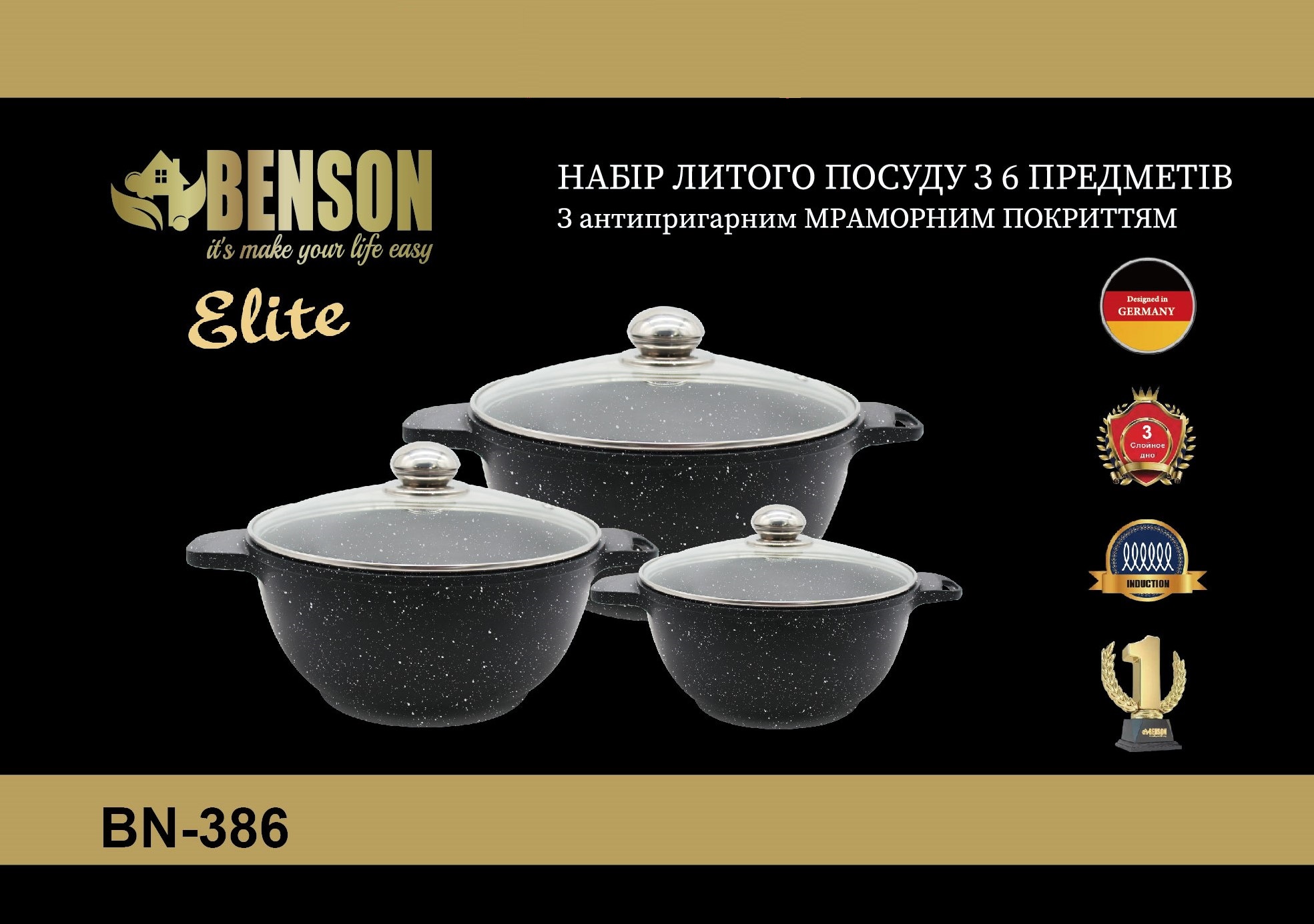 Набор кастрюль Benson с мраморным антипригарным покрытием. Изготовлен из литого алюминия — идеальный материал для жарки и тушения продуктов.