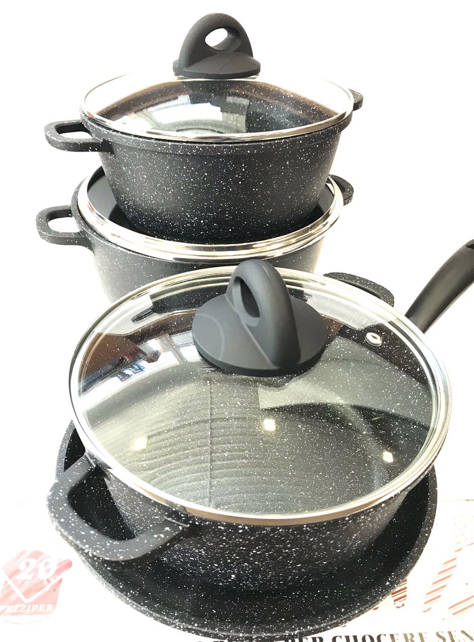 Набор кастрюль Benson с мраморным антипригарным покрытием. Изготовлен из литого алюминия — идеальный материал для жарки и тушения продуктов.