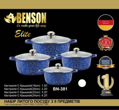 Набор посуды Benson состоит из четырёх кастрюль с крышками. Изделия выполнены из литого алюминия с мраморным антипригарным покрытием, устойчивым к царапинам.