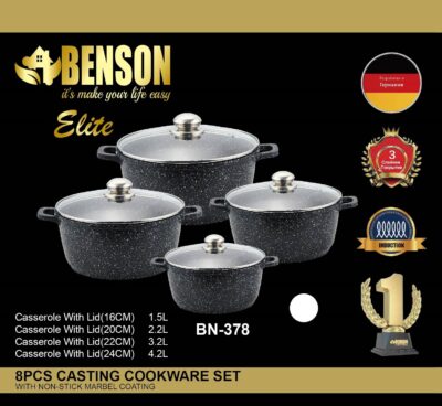Набор посуды Benson состоит из четырёх кастрюль с крышками. Изделия выполнены из литого алюминия с мраморным антипригарным покрытием, устойчивым к царапинам.