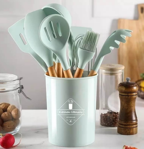 представляет собой 12 необходимых предметов для каждой хозяйки ведерко для хранения и подставку грязную кухонную утварь, что бы не испачкать кухонный стол.