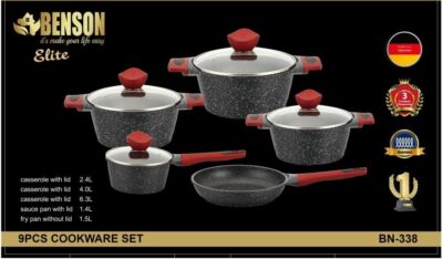Набор посуды Benson состоит из трех кастрюль с крышками и сковороды. Изделия выполнены из литого алюминия с мраморным антипригарным покрытием, устойчивым к царапинам. Кроме того, такое покрытие позволяет готовить здоровую пищу с минимальным добавлением жира или масла, легко моется. Сковорода оснащена удобной не нагревающейся бакелитовой ручкой, обеспечивающей защиту ваших рук. Крышки изготовлены из термостойкого стекла и оснащены отверстием для выхода пара. Такая крышка позволяет следить за процессом приготовления пищи без потери тепла. Она плотно прилегает к краю кастрюли, сохраняя аромат блюд.