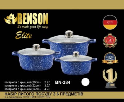 Набор посуды Benson состоит из трёх кастрюль с крышками. Изделия выполнены из литого алюминия с гранитным антипригарным покрытием, устойчивым к царапинам.