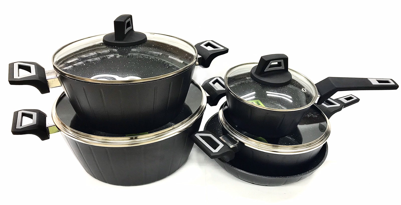 Набор посуды Benson состоит из трех кастрюль, ковша с крышками и сковороды. Изделия выполнены из литого алюминия с мраморным антипригарным покрытием, устойчивым к царапинам.