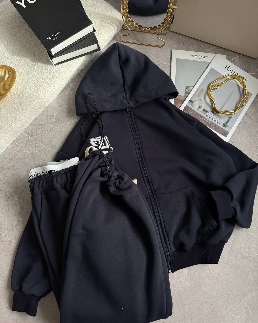 Объемный оверсайз спортивный костюм. Теплый и приятный для тела по сезону. Рисунки – накатка. Худые на змейке и капюшоном. Брюки на резинке из лого, снизу идут на фиксаторах для удобства ношения. Манжеты Рибана.