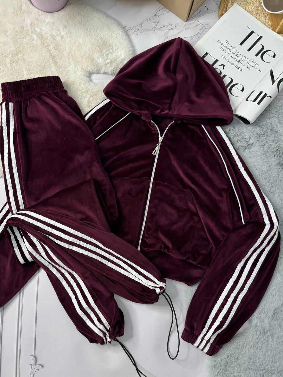 Будьте первым, кто оставил отзыв на “Плюшевый-велюровый костюм: кофта с двойным капюшоном+штаны на затяжках бордо”