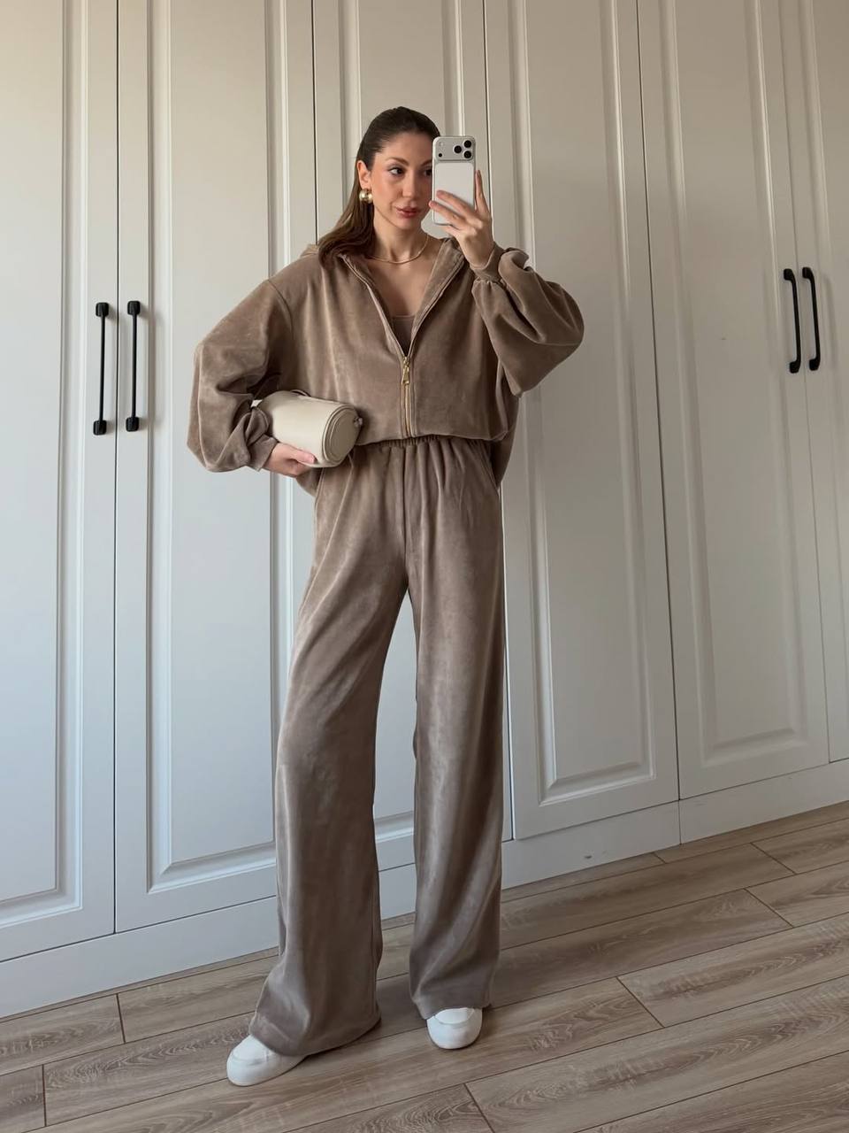 Плюшевый велюровый тройка (кофта оверсайз на молнии+прямые брюки) бежевый