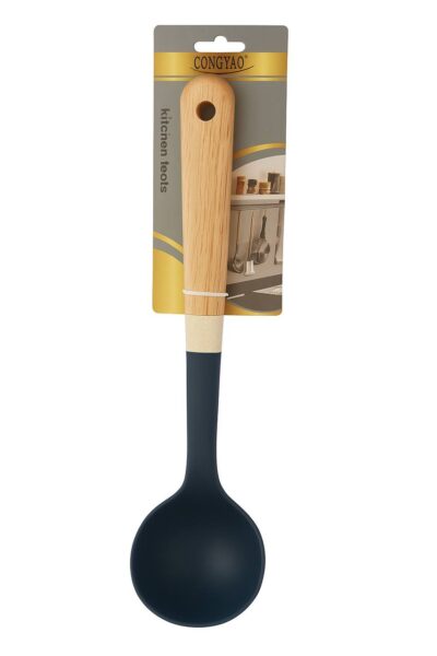 Прочный половник с удобной деревянной ручкой, идеально подходит для разливания супов, соусов и горячих блюд.