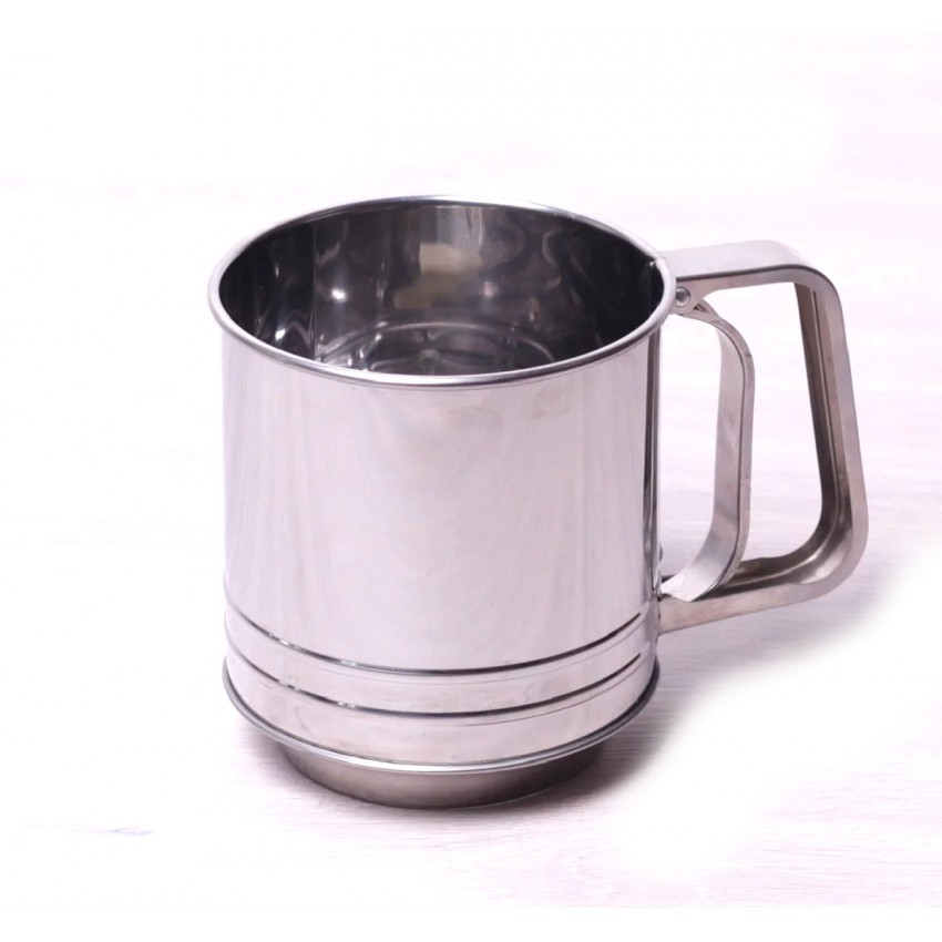 Сито механическое из нержавеющей стали для просеивания муки, сахарной пудры, манки, какао и мелких сыпучих продуктов. Объём 500 грамм. Двойное сито, 3 ножа.