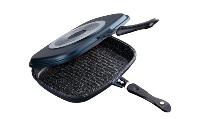 Сковорода гриль двойная 32 см, антипригарное гранитное темное покрытие, литой алюминий, микс цветов.