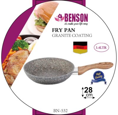 Сковорода фирмы Benson (BN-532) выполнена из литого алюминия с гранитным антипригарным покрытием, с красными, серыми и белыми вкраплениями, устойчивому к царапинам.
