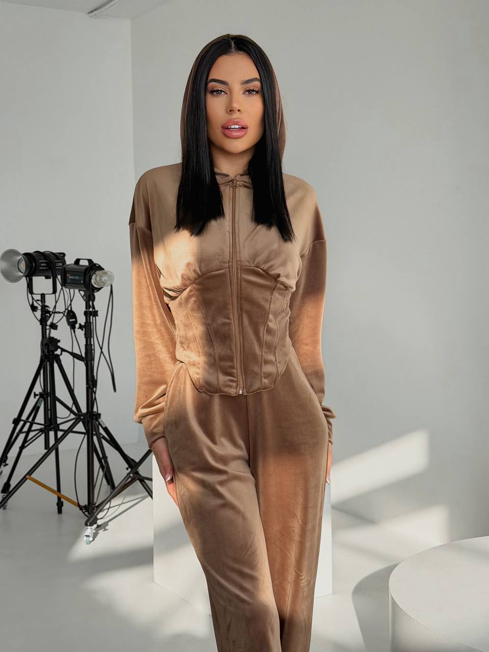 Спортивный костюм (приталенная кофта на молнии+прямые брюки) мокко