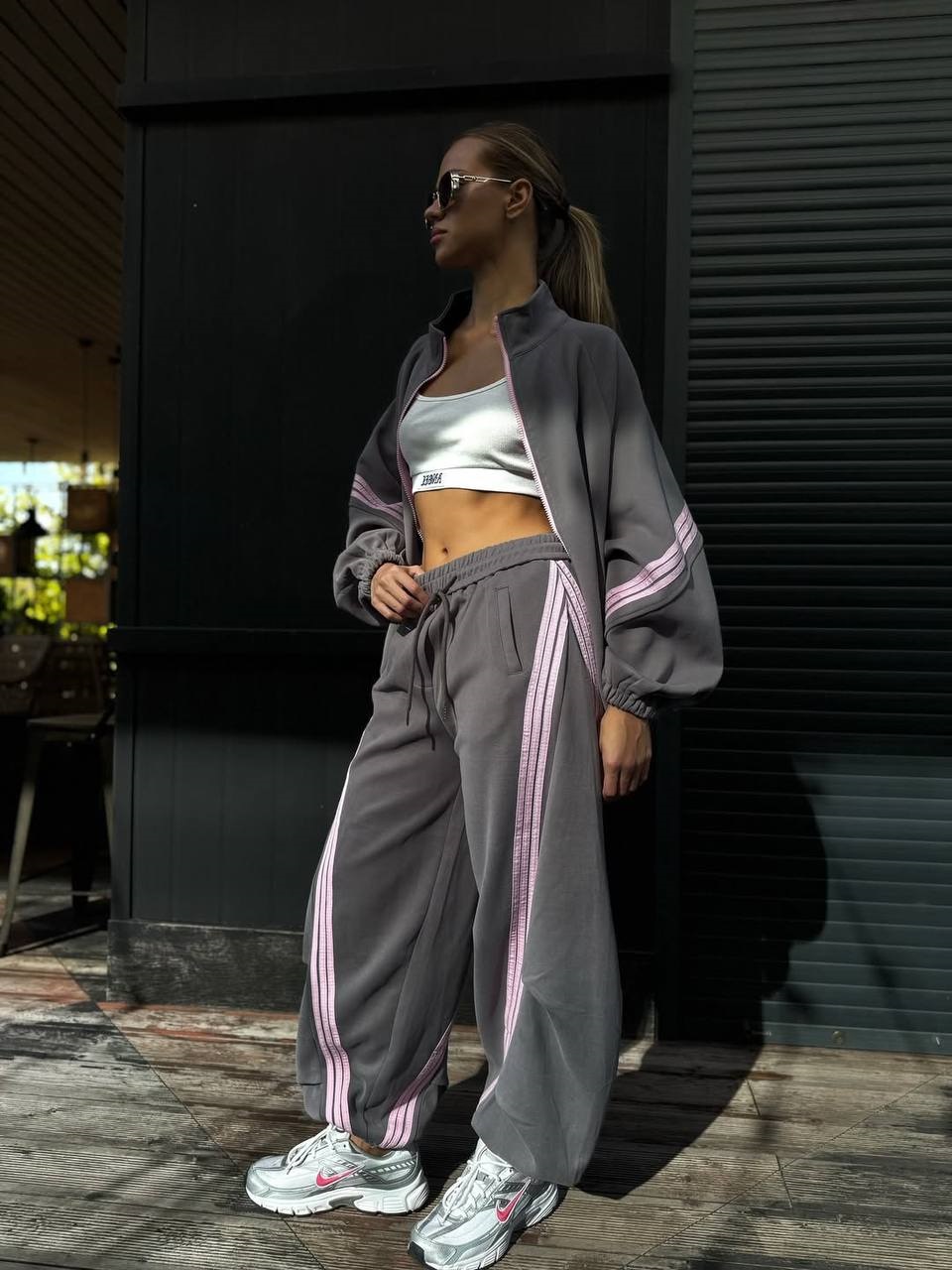 Спортивный костюм с контрастными полосами свободного края (кофта на молнии+брюки) серый
