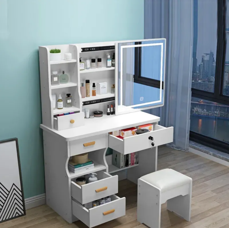 Стол макияжный с LED зеркалом и пуфом STL-MD 87 белый – это идеальное решение для современных интерьеров, сочетая в себе функциональность и стиль. Благодаря встроенному LED зеркалу, он не только служит практичным элементом мебели, но и добавляет дополнительные возможности по уходу за собой. Этот стол очень удобен в использовании: очень просто трансформируется, позволяя сделать место для работы либо отдыха зависимо от ваших потребностей.