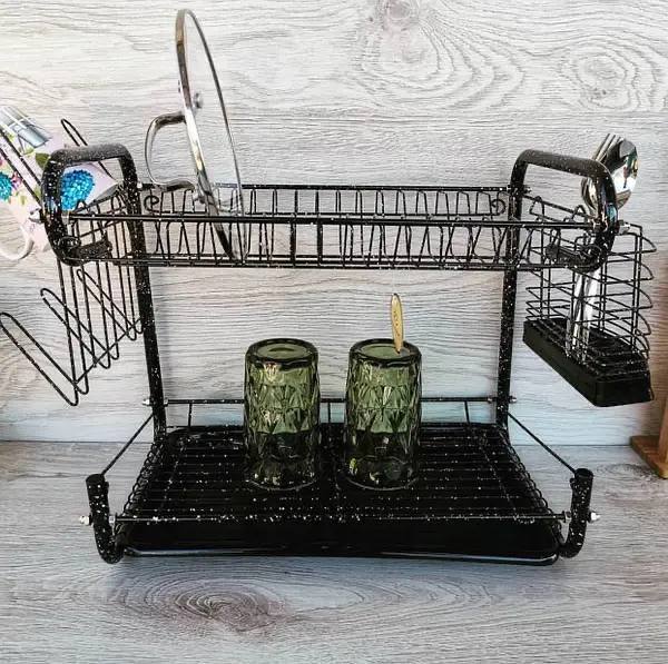 Двухъярусная сушилка для посуды предназначена для компактного хранения и высыхания посуды. Конструкция сушки гарантирует быстрое высыхание посуды, сток воды в поддон для сушки, таким образом защищая столешницу или другую мебельную поверхность от влаги.