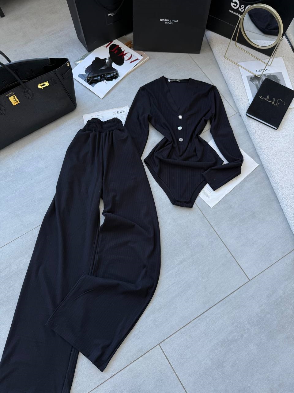 Будьте первым, кто оставил отзыв на “Теплый Костюм (боди+свободные брюки) ангора в рубчик черный”
