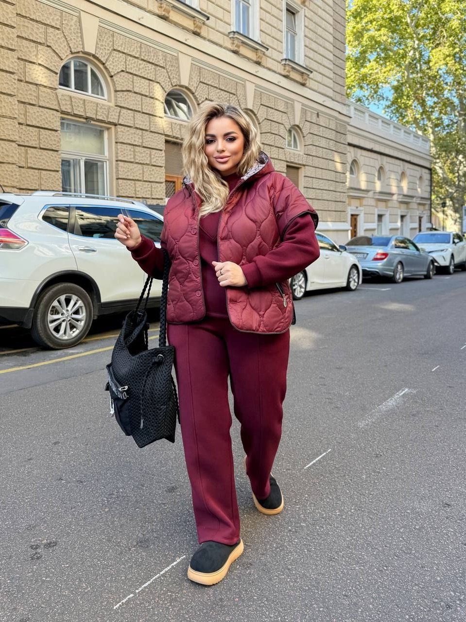 Теплый костюм (стеганный жилет с узором+капюшоном+кофта+брюки прямого кроя со строчкой) бордо