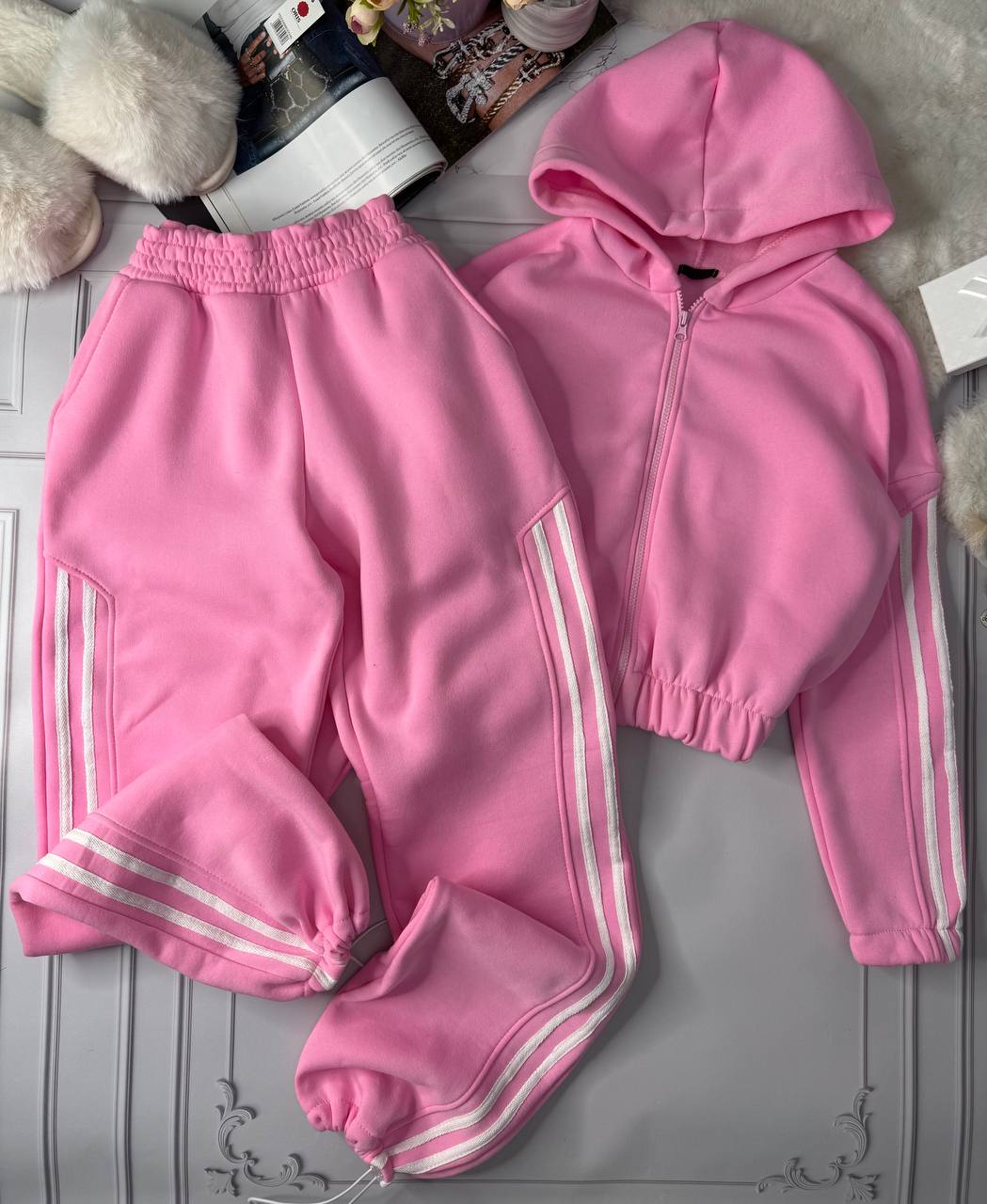 Теплый костюм с лампасами (кофта на молнии+брюки низ на затяжках) нежно-розовый