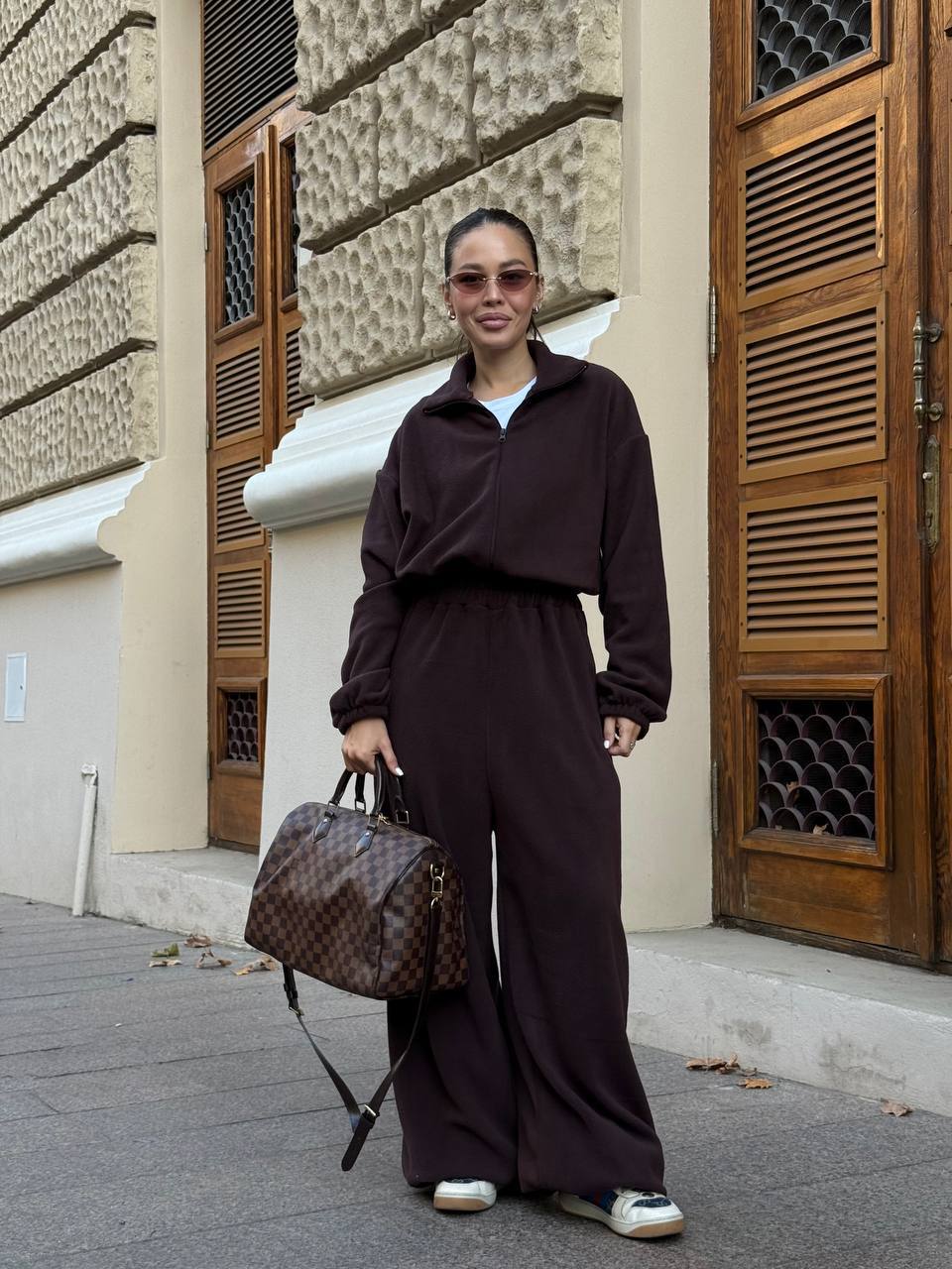 Удобный флисовый костюм: кофта на молнии+штаны снизу на затяжках шоколад