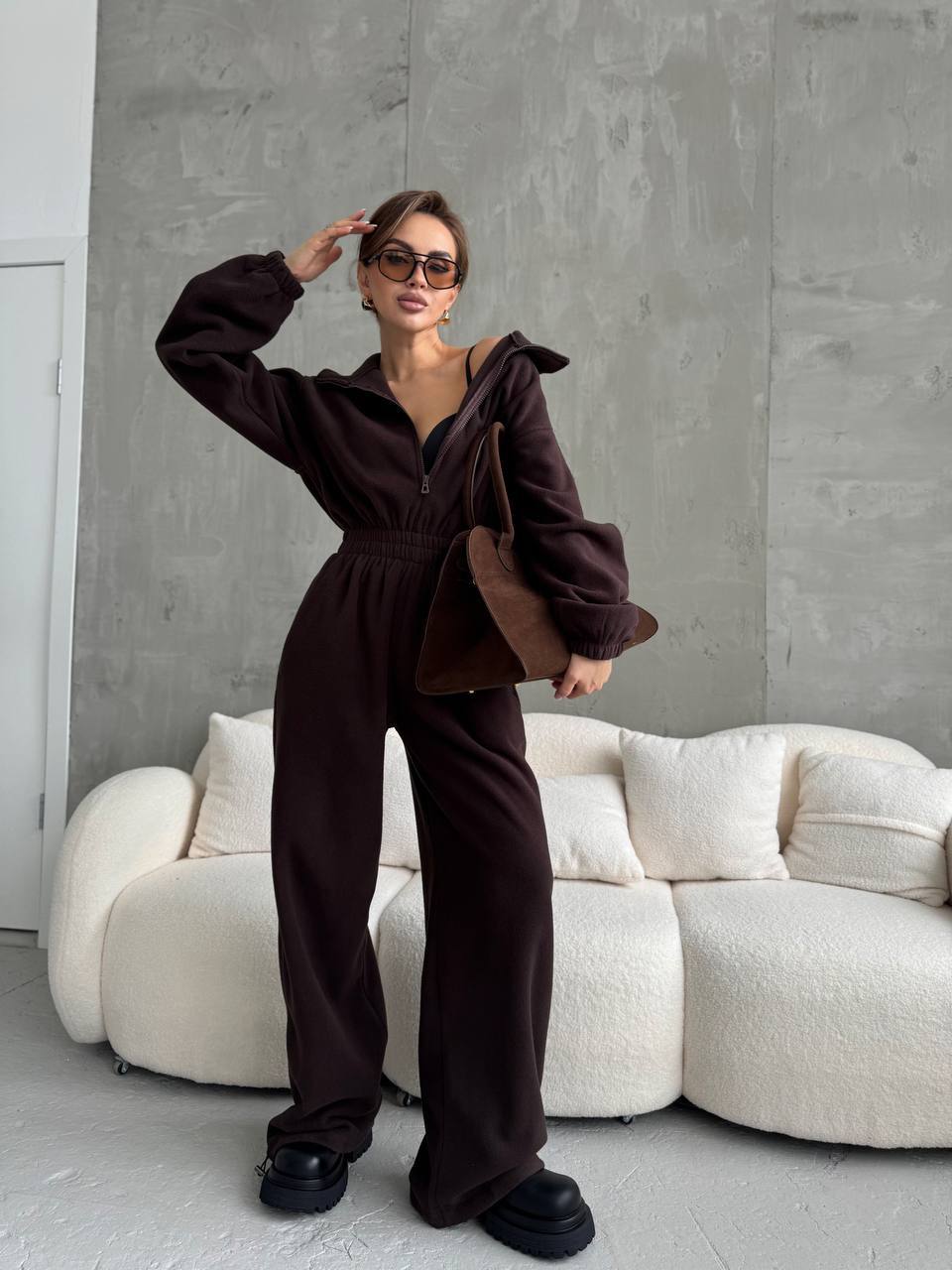 Удобный флисовый костюм: кофта на молнии+штаны снизу на затяжках шоколад
