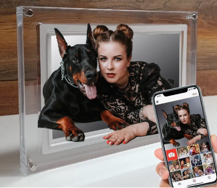 Акриловая электронная рамка имеет большой сенсорный FULL HD IPS экран 10 дюймов с разрешением 1920*1080, встроенную память 32 Гб для хранения,